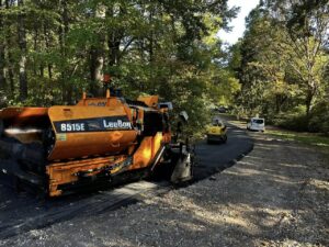 With the base ready, we laid fresh asphalt in one continuous pass where possible, adjusting our speed to maintain temperature and smoothness under heavy tree shadows.